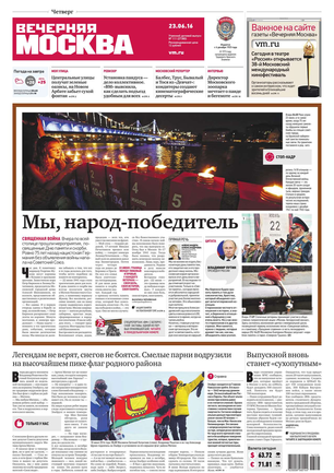 «Вечерняя Москва» — ежедневная российская вечерняя газета, старейшее из вечерних изданий в России, учрежденное в 1923 году. Выходит пять дней в неделю, кроме субботы и воскресенья. Отличается тем, что рассказывает о событиях еще не завершившегося дня. Оперативно освещает хронику и особенности жизни Москвы, охватывает все слои общества и большинство профессиональных и возрастных групп читателей.Издание представлено тремя выпусками – утренним ежедневным, вечерним (выходит три раза в неделю), еженедельным (выходит по четвергам).
