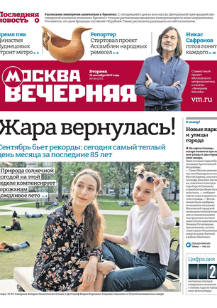 «Вечерняя Москва» — ежедневная российская вечерняя газета, старейшее из вечерних изданий в России, учрежденное в 1923 году. Выходит пять дней в неделю, кроме субботы и воскресенья. Отличается тем, что рассказывает о событиях еще не завершившегося дня. Оперативно освещает хронику и особенности жизни Москвы, охватывает все слои общества и большинство профессиональных и возрастных групп читателей.Издание представлено тремя выпусками – утренним ежедневным, вечерним (выходит три раза в неделю), еженедельным (выходит по четвергам).