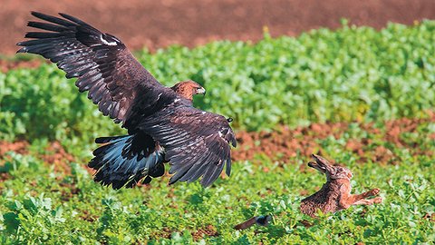 Трудно сказать, почему этот заяц оказался на открытом месте на краю скошенного луга. В бинокль было видно, как он часто ненадолго останавливался: то ли что-то искал, то ли кормился, затем короткими перебежками продолжал путь. Однако, даже находясь в движении, косой то и дело озирался. Наверное, понимал, как опасно быть далеко от надёжного укрытия, ведь ближайший лес — с одной стороны и заросли кустарников — с другой, находились не меньше чем в ста метрах от его стоянок. И всё-таки, несмотря на осторожность, беда подстерегла его, причём оттуда, откуда он её, думаю, не ждал…